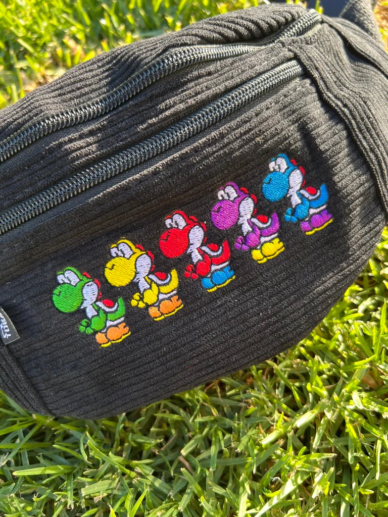 Our bum bag showcases a corduroy exterior and polyester lining interior. Featuring a more spacious main compartment and a smaller sub compartment pocket, this bag can be worn on the waist or crossbody. The front is accented with colorful embroidered character design, adding a playful touch of personality.